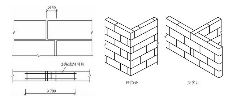并不小于150mm。如不能滿足時(shí),應(yīng)在水平灰縫設(shè)置的拉結(jié)鋼筋或4鋼筋網(wǎng)片,結(jié)鋼筋或鋼筋網(wǎng)片的長(zhǎng)度應(yīng)不小于700mm。